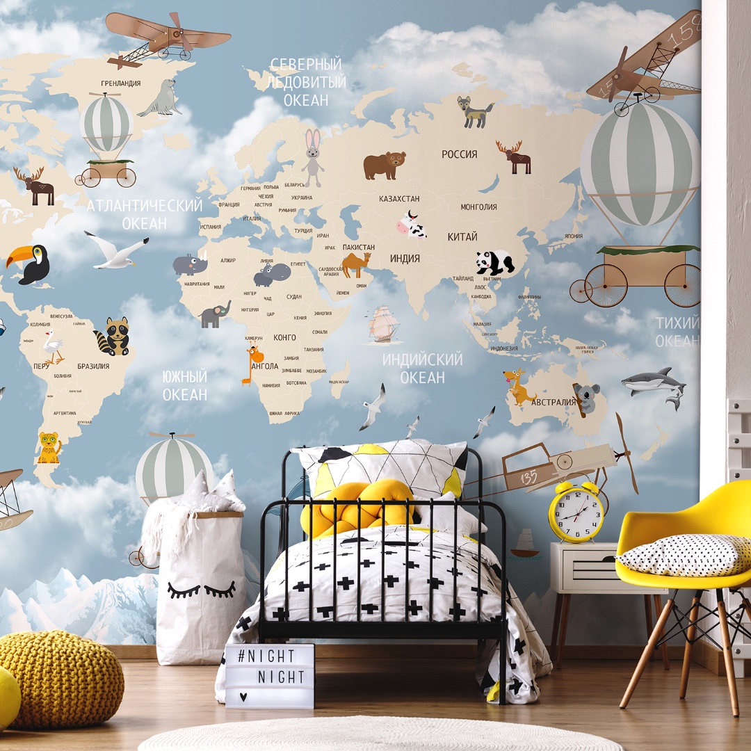 Весь мир на вашей стене. Покажите вашему ребенку карту мира размером с комнату, путешествуйте и совершайте открытия вместе. Обои карты возможно масштабировать под размер вашей стены. С такими обоями весело познавать мир и, кроме того ваш, ребенок теперь точно не перепутает Швецию с Норвегией.