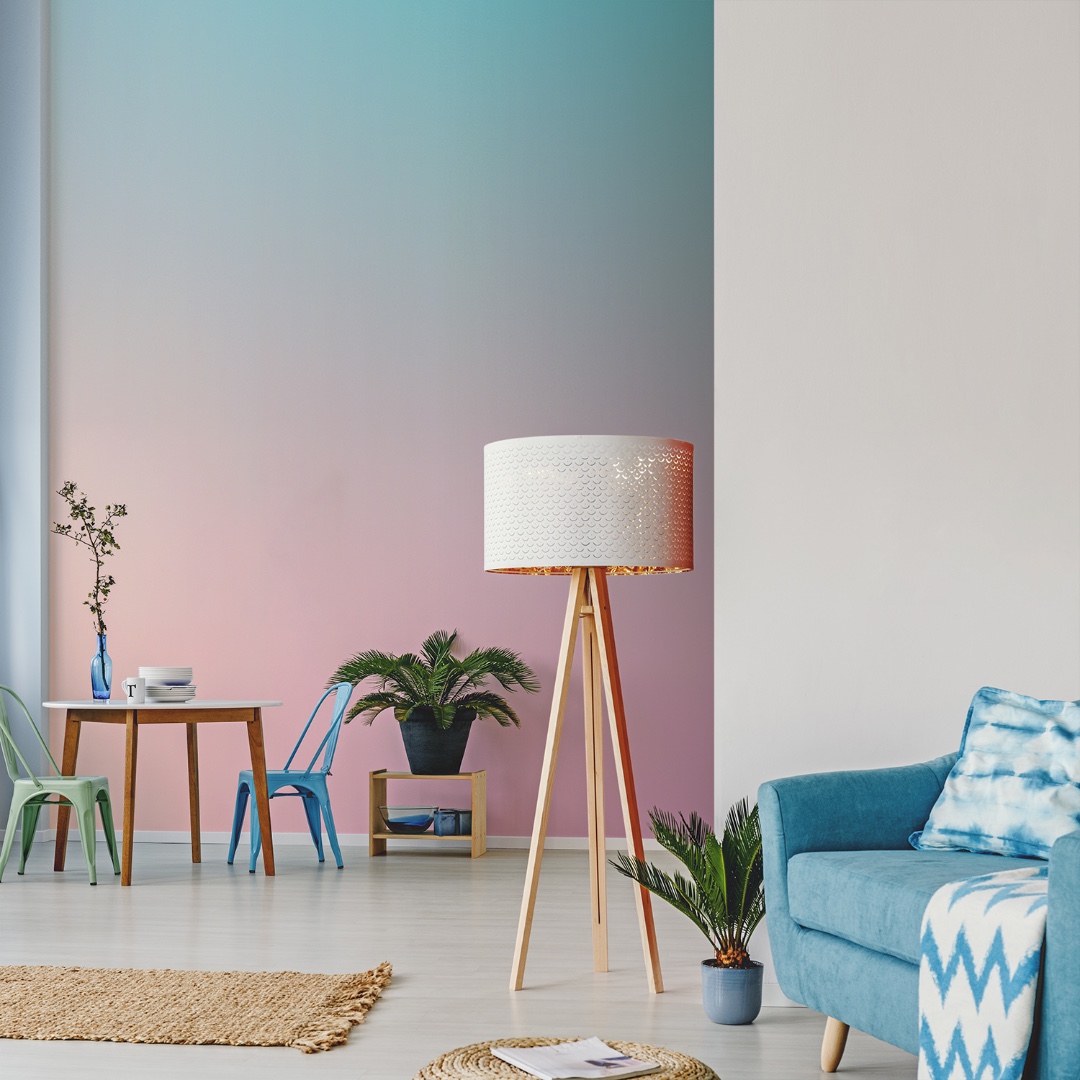 Градиент сегодня один из излюбленных приемов дизайнеров. Его популярность в последние пару лет вернулась с новой силой и после минималистичного и однотонного стиля, сейчас градиент сейчас его используют везде от фирменного стиля социальных сетей до презентации нового смартфона. Теперь вы можете поклеить его на и стену! Обои градиент простой способ создать нестандартный интерьер вашей комнаты. Такие обои будут ассоциироваться с природой напоминая вечерний небосвод или рассвет на морском берегу. Кроме того правильно подобранный градиент создает дополнительный объем и зрительно расширяет пространство.