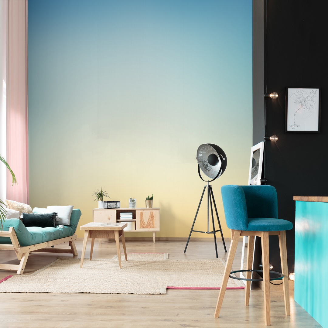Градиент сегодня один из излюбленных приемов дизайнеров. Его популярность в последние пару лет вернулась с новой силой и после минималистичного и однотонного стиля, сейчас градиент сейчас его используют везде от фирменного стиля социальных сетей до презентации нового смартфона. Теперь вы можете поклеить его на и стену! Обои градиент простой способ создать нестандартный интерьер вашей комнаты. Такие обои будут ассоциироваться с природой напоминая вечерний небосвод или рассвет на морском берегу. Кроме того правильно подобранный градиент создает дополнительный объем и зрительно расширяет пространство.